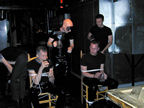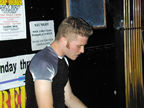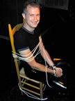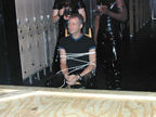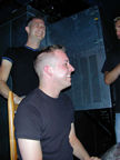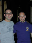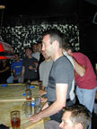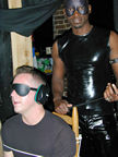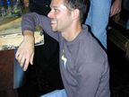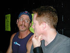 On the evening of August 19th, our friends Russ and Rono arrived at our door, dressed all in black, wearing masks. They put handcuffs on us, and then led us to their car where they added blindfolds. They drove us around for a while, then made us walk down a block and across a street (still blindfolded!). We then entered a building, were led to the back, and then tied to two chairs. At this point the blindfolds came off and we saw about two dozen of our friends cheering. They then proceeded to ask us a set of questions separately, then we were re-united and they compared our answers. Sort of a gay Newlywed Game. We actually did better than most people thought we would!